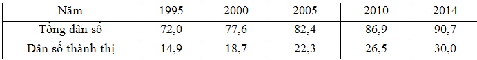 Cho bảng số liệu Dân số và dân số thành thị nước ta giai đoạn 1995 – 2014 (Đơn vị: triệu