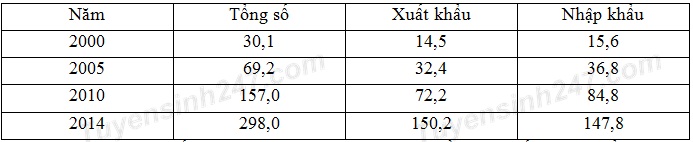 Cho bảng số liệu Giá trị xuất – nhập khẩu hàng hóa của nước ta giai đoạn 2000 – 2014 (