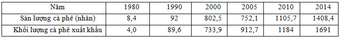 Căn cứ vào bảng số liệu, cho biết nhận xét nào sau đây đúng về sản lượng cà phê nhân và khối lượng cà phê xuất khẩu, trong giai đoạn 1980 – 2014?