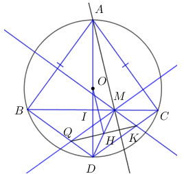 a) Cho tam giác nhọn ABC cân tại A, nội tiếp đường tròn tâm O đường kính AD. Hai đoạn thẳng BC và AD cắt nhau tại I. Gọi M là điểm nằm trên đoạn thẳng CI (M khác C và I). Đường thẳng qua M song song với BD cắt CD tại K; đường thẳng qua M song song với CD cắt BD tại Q. Chứng minh rằng AM vuông góc với QK.