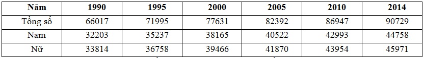 Cho bảng số liệu: DẤN SỐ TRUNG BÌNH PHÂN THEO GIỚI TÍNH CỦA NƯỚC TA GIAI ĐOẠN 1990 –