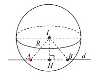 Sử dụng định lí Pytago tính bán kính R của mặt cầu \(\left( S \right):\,\,R = \sqrt {I{H^2} + {{\left( {\frac{{AB}}{2}} \right)}^2}} \) với H là hình chiếu của I trên đường thẳng \(d\).