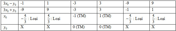 Đánh giá, tìm giá trị nguyên của \({x_0},\,\,{y_0}\), với \(\,M\left( {{x_0};{y_0}} \right) \in \left( H \right)\).