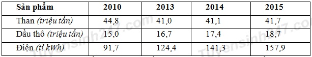 Cho bảng số liệu sau: SẢN LƯỢNG THAN, DẦU THÔ VÀ ĐIỆN CỦA NƯỚC TA QUA CÁC NĂM (Nguồn: Niên