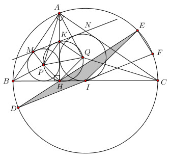 Cho tam giác ABC vuông tại A, đường cao AH. Gọi (P) và (Q) theo thứ tự là đường tròn nội tiếp của tam giác AHB và AHC. Kẻ tiếp tuyến chung ngoài( khác BC) của 2 đường tròn (P) và (Q), nó cắt AB, AC, AH theo thứ tự tại M, N, K.