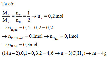 Một hỗn hợp X gồm một ankin và H2 có thể tích bằng 8,96 lít ( đktc) và mX = 4,6g. Cho hỗn hợp X qua Ni nóng, phản ứng hoàn toàn cho ra hỗn hợp khí Y có tỉ khối so với hỗn hợp X bằng 2. Số mol H2 phản ứng, khối lượng và CTPT của ankin là: