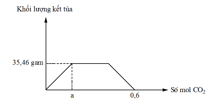 Khi mol CO2 = 0,6 (mol) thì kết tủa tan hết, dung dịch thu được chứa Ba2+ (0,18 mol), HCO3- ( 0,6 mol) , Na+ (x mol)
