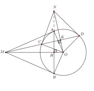 b) Vẽ cát tuyến MCD không đi qua tâm O của đường tròn đó sao cho điểm C nằm giữa hai điểm M và D. Tiếp tuyến tại điểm C và điểm D của đường tròn (O) cắt nhau tại N. Gọi H là giao điểm của AB và MO, K là giao điểm của CD và ON. Chứng minh rằng \(OH.OM=OK.ON={{R}^{2}}\)