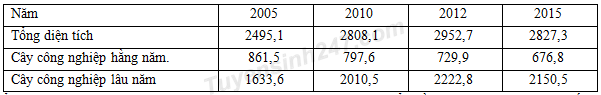 Cho bảng số liệu: DIỆN TÍCH CÂY CÔNG NGHIỆP NƯỚC TA GIAI ĐOẠN 2005 – 2015 (Đơn vị: nghìn