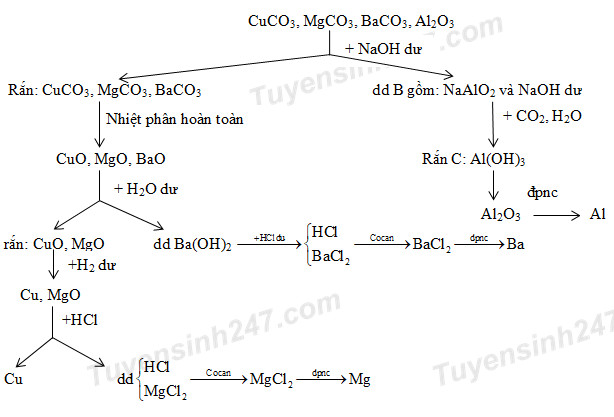 2. Từ hỗn hợp gồm CuCO3, MgCO3, Al2O3 và BaCO3 hãy điều chế từng kim loại riêng biệt với điều kiện không làm thay đổi khối lượng của từng kim loại trong hỗn hợp.
