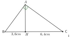 Cho tam giác ABC vuông tại A, đường cao AH \(\left( H\in BC \right)\) . Biết BH = 3,6cm và HC = 6,4 cm.