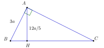 Cho tam giác \(ABC\) vuông tại \(A\) có đường cao \(AH\ \left( H\in BC \right).\)Biết \(AB=3a,\ \ AH=\frac{12}{5}a.\) Tính theo \(a\) độ dài \(AC\) và \(BC.\)