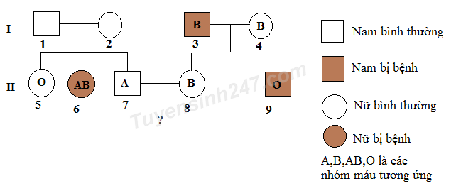 Sự di truyền một bệnh P ở người do 1 trong 2 alen quy định và được thể hiện qua sơ đồ phả hệ dưới đây. Các chữ cái cho biết các nhóm máu tương ứng của mỗi người. Biết rằng sự di truyền bệnh P độc lập với di truyền các nhóm máu, quá trình giảm phân bình thường và không có đột biến xảy ra.