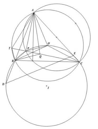 Cho tam giác ABC có 3 góc nhọn, \(AB<AC\) và nội tiếp đường tròn \(\left( O \right).\) Đường tròn ngoại tiếp tam giác BOC cắt các đường thẳng AB và AC theo thứ tự tại D và E. Trên đường tròn ngoại tiếp tam giác BOC lấy điểm P sao cho AP vuông góc với PC. Đường thẳng qua B song song với OP cắt PC tại Q. Chứng minh rằng :