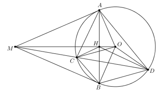 Cho đường tròn tâm (O), từ điểm M ở bên ngoài đường tròn (O) kẻ các tiếp tuyến MA, MB (A, B là các tiếp điểm), kẻ cát tuyến MCD không đi qua tâm O (C nằm giữa M và D; O và B nằm về hai phía so với cát tuyến MCD).