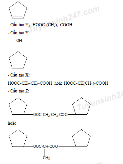 Mà khi đun Y1 với KMnO4/H2SO4 thu được Y2 duy nhất, không có khí thoát ra, Y2 có cấu tạo mạch thẳng và là điaxit nên Y1 có cấu tạo mạch vòng, chứa 1 liên kết đôi => CTCT của Y