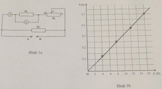 a. Người ta điều chỉnh con chạy C và ghi lại số chỉ của vôn kế và ampe kế. Kết quả được biểu diễn bởi đồ thị trên Hình 1b. Dựa vào đồ thị, hãy tính trị số của điện trở R.