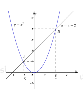 b) Tìm tọa độ giao điểm \(A,\;B\) của đồ thị hàm số \(y = {x^2}\) và \(y = x + 2.\) Gọi \(D,\;C\) lần lượt là hình chiếu vuông góc của \(A,\;B\) lên trục hoành. Tính diện tích tứ giác \(ABCD.\)