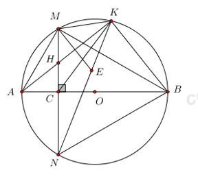 Cho đường tròn (O) đường kính AB = 2R, C là trung điểm OA và dây cung MN vuông góc với OA tại C. Gọi K là điểm tùy ý trên cung nhỏ BM (K khác B, M), H là giao điểm của AK và MN.