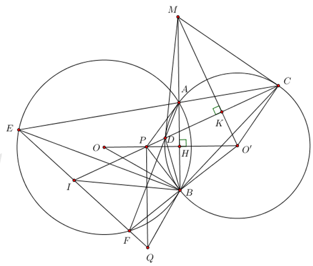 Cho hai đường tròn \(\left( O \right)\) và \(\left( O' \right)\) cắt nhau tại A và B. Trên tia đối của AB lấy điểm M khác A. Qua M kẻ các tiếp tuyến MC, MD với \(\left( O' \right)\) (C, D là các tiếp điểm và D nằm trong \(\left( O \right)\)).
