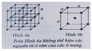c) Bằng các nghiên cứu, người ta phát hiện ra rằng các nguyên tử X sắp xếp tuần hoàn tạo thành mạng tinh thể gồm các ô hình lập phương giống hệt nhau xếp chồng lên nhau (Hình 4a). Ở mỗi ô lập phương nhỏ nhất (gọi là ô mạng cơ sở) có một nguyên tử nằm tại tâm và ở mỗi đỉnh của nó đều có một nguyên tử (Hình 4b). Hãy xác định chiều dài a của các cạnh ô mạng cơ sở. Biết khối lượng riêng của X đo được là D = 7800 kg/m3.