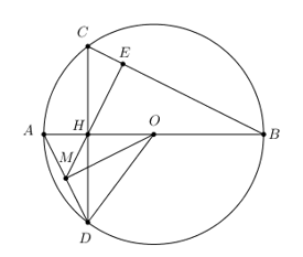 Cho đường tròn (O) đường kính AB và một dây CD vuông góc với AB tại H (H không trừng với các điểm A, B, O). Gọi M là trung điểm của AD. Chứng minh: