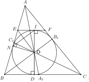 Cho tam giác ABC ngoại tiếp đường tròn (O; R). Đường tròn \(\left( O;R \right)\) tiếp xúc với các cạnh BC, AB lần lượt tại D, N. Kẻ đường kính DI của đường tròn \(\left( O;R \right)\) Tiếp tuyến của đường tròn \(\left( O;R \right)\) tại I cắt các cạnh AB, AC lần lượt tại E, F.