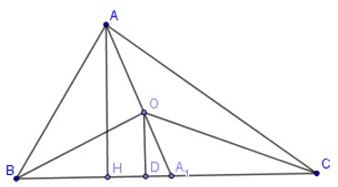 3) Gọi \({{A}_{1}}\)là giao điểm của AO với cạnh BC, \({{B}_{1}}\) là giao điểm của BO với cạnh AC, \({{C}_{1}}\) là giao điểm của CO với cạnh AB. Chứng minh \(\frac{AO}{A{{A}_{1}}}+\frac{BO}{B{{B}_{1}}}+\frac{CO}{C{{C}_{1}}}=2\)