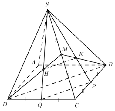 Chóp SABCD. ABCD là hình bình hành. M, P, Q lần lượt là trung điểm của SC, CB, CD. Tìm giao tuyến