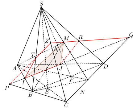 c) Trong \(\left( {ABCD} \right)\) kẻ \(IJ\) cắt \(BC,CD\) lần lượt tại P và Q. Từ đó tìm các giao tuyến của (MIJ) với tất cả các mặt của hình chóp tìm thiết diện.
