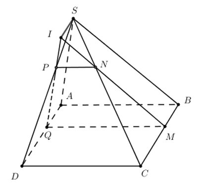 Chóp SABCD. ABCD là hình bình hành. \(M\in BC,\,N\in SC,\,P\in SD,\,Q\in AD\) để \(MN\parallel SB,\,QM\parallel PN\parallel CD.\)