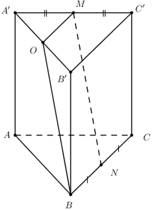 Lăng trụ ABC.A’B’C’. M, N, O là trung điểm của A’C’, BC, A’B’. Chứng minh \(MN\parallel BO\)