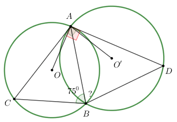 Cho hai đường tròn (O) và (O’) cắt nhau tại A, B. Tiếp tuyến tại A của đường tròn (O’) cắt (O) tại C và của (O) cắt (O’) tại D. Biết \(\widehat {ABC} = {75^0}\) . Tính \(\widehat {ABD}?\)