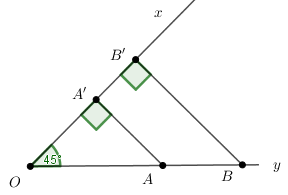 Cho \(\widehat {xOy} = {45^0}.\) Trên tia Oy lấy hai điểm A, B sao cho \(AB = \sqrt 2 \left( {cm} \right).\) Tính độ dài hình chiếu vuông góc của đoạn thẳng AB trên Ox.