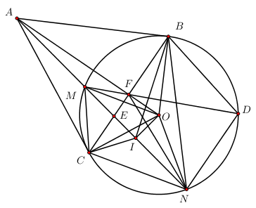Cho đường tròn (O;R) và điểm A ở bên ngoài đường tròn đó. Kẻ cát tuyến AMN không đi qua O (M nằm giữa A và N). Kẻ hai tiếp tuyến AB, AC với (O;R) (B, C là hai tiếp điểm và C thuộc cung nhỏ MN). Đường thẳng BC cắt MN và AO lần lượt tại E, F. Gọi I là trung điểm của MN.