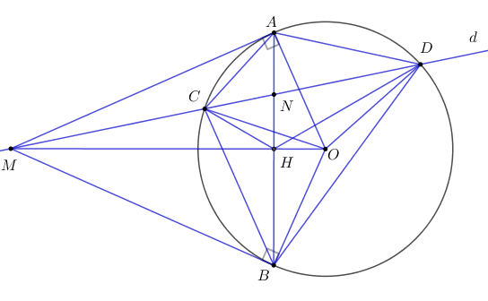 Cho đường tròn (O; R) và điểm M cố định nằm ngoài (O; R). Từ M kẻ các tiếp tuyến MA, MB tới (O; R) (A, B là các tiếp điểm). Đường thẳng (d) bất kỳ qua M và cắt (O; R) tại hai điểm phân biệt C, D (C nằm giữa M và D). Gọi N là giao điểm của AB và CD.