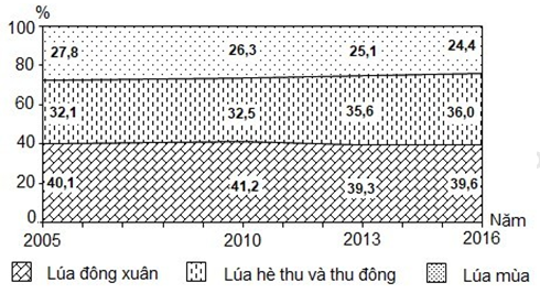 Cho biểu đồ: CƠ CẤU DIỆN TÍCH LÚA PHÂN THEO MÙA VỤ CỦA NƯỚC TA, GIAI ĐOẠN 2005 - 2016 (Nguồn