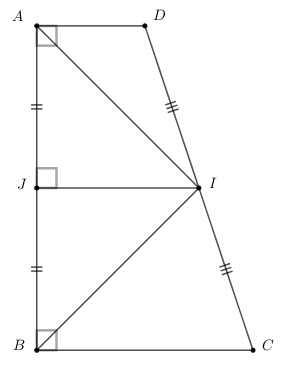 Cho hình thang \(ABCD\) vuông ở \(A,\;B,\;\;AB = 3a,\;BC = 2a,\;AD = a.\) Gọi \(I\) là trung điểm của \(CD.\) Chứng minh \(\angle AIB = {90^0}.\)
