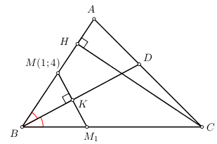 Cho tam giác ABC có \(M\left( {1;4} \right)\) là trung điểm của AB. Phân giác \(\left( {BD} \right):\,\,x -