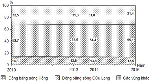 Cho biểu đồ: CƠ CẤU DIỆN TÍCH LÚA PHÂN THEO VÙNG CỦA NƯỚC TA, GIAI ĐOẠN 2010 - 2016 (Nguồn