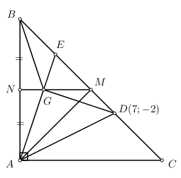 Cho tam giác ABC vuông cân ở A. M là trung điểm của BC. G là trọng tâm của tam giác ABM. \(D\left( {7; - 2} \right)\) thuộc đoạn MC để \(GA = GD\). Phương trình \(AG:\,\,3x - y - 13 = 0\). Lập phương trình AB biết \({x_A} < 4.\)