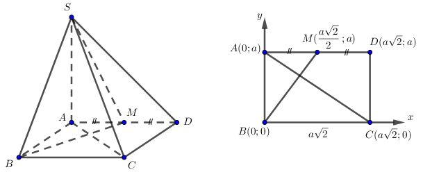 (B2006): Chóp S.ABCD, \(SA \bot \left( {ABCD} \right);\,\,ABCD\) là hình chữ nhật. \(AB = a;\,\,AD = a\sqrt 2 \). M là trung điểm của AD. Chứng minh \(\left( {SMB} \right) \bot \left( {SAC} \right)\).