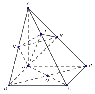 Chóp S.ABCD, \(SA \bot \left( {ABCD} \right);\,\,ABCD\) là hình vuông tâm O. Vẽ H, I, K là hình chiếu của A lên \(SB,\,\,SC,\,\,SD\).