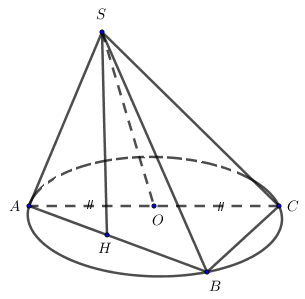 Trong \(\left( {O;R} \right)\) vẽ dây AB, đường kính AC. \(H \in AB\). Trên đường thẳng vuông góc với mặt phẳng \(\left( {ABC} \right)\) tại H lấy điểm S để \(SO = R\).