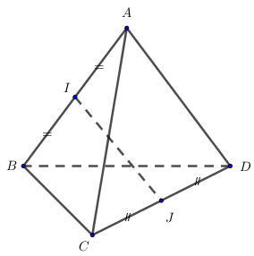 b) I; J lần lượt là trung điểm của AB, CD. Chứng minh \(IJ \bot AB\).