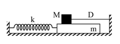 Cho cơ hệ như hình bên. Vật m khối lượng 100 g có thể chuyển động tịnh tiến, không ma sát trên mặt phẳng nằm ngang dọc theo trục lò xo có k = 40 N/m. Vật M khối lượng 300 g có thể trượt trên m với hệ số ma sát μ = 0,2. Ban đầu, giữ m đứng yên ở vị trí lò xo dãn 4,5 cm, dây D (mềm, nhẹ, không dãn) song song với trục lò xo. Biết M luôn ở trên m và mặt tiếp xúc giữa hai vật nằm ngang. Lấy g = 10 m/s2. Thả nhẹ cho m chuyển động. Tính từ lúc thả đến khi lò xo trở về trạng thái có chiềudài tự nhiên lần thứ 3 thì tốc độ trung bình của m là