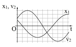 Hai vật M1 và M2 dao động điều hòa cùng tần số. Hình bên là đồ thị biểu diễn sự phụ thuộc của li độ x1 của M1 và vận tốc v2của M2 theo thời gian t. Hai dao động của M2 và M1 lệch pha nhau