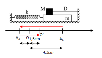 Cho cơ hệ như hình bên. Vật m khối lượng 100 g có thể chuyển động tịnh tiến, không ma sát trên mặt phẳng nằm ngang dọc theo trục lò xo có k = 40 N/m. Vật M khối lượng 300 g có thể trượt trên m với hệ số ma sát μ = 0,2. Ban đầu, giữ m đứng yên ở vị trí lò xo dãn 4,5 cm, dây D (mềm, nhẹ, không dãn) song song với trục lò xo. Biết M luôn ở trên m và mặt tiếp xúc giữa hai vật nằm ngang. Lấy g = 10 m/s2. Thả nhẹ cho m chuyển động. Tính từ lúc thả đến khi m đổi chiều chuyển động lần thứ 2 thì tốc độ trung bình của m là