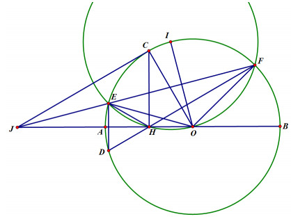 Cho nửa đường tròn tâm (O) đường kính \(AB = 2R\), H là điểm cố định trên OA \(\left( {H \ne O;\,\,H \ne A} \right)\). Đường thẳng qua H vuông góc với AB cắt nửa đường tròn tại C. Gọi E là điểm thay đổi trên cung AC \(\left( {E \ne A;E \ne C} \right)\), F thay đổi trên cung BC \(\left( {F \ne B;F \ne C} \right)\) sao cho \(\widehat {EHC} = \widehat {FHC}\).