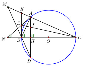 Cho đường tròn (O) đường kính BC và H là 1 điểm nằm trên đoạn thẳng BO (điểm H không trùng với hai điểm B và O). Qua H vẽ đường thẳng vuông góc với BC, cắt đường tròn (O) tại A và D. Gọi M là giao điểm của AC và BD, qua M vẽ đường thẳng vuông góc BC tại N.